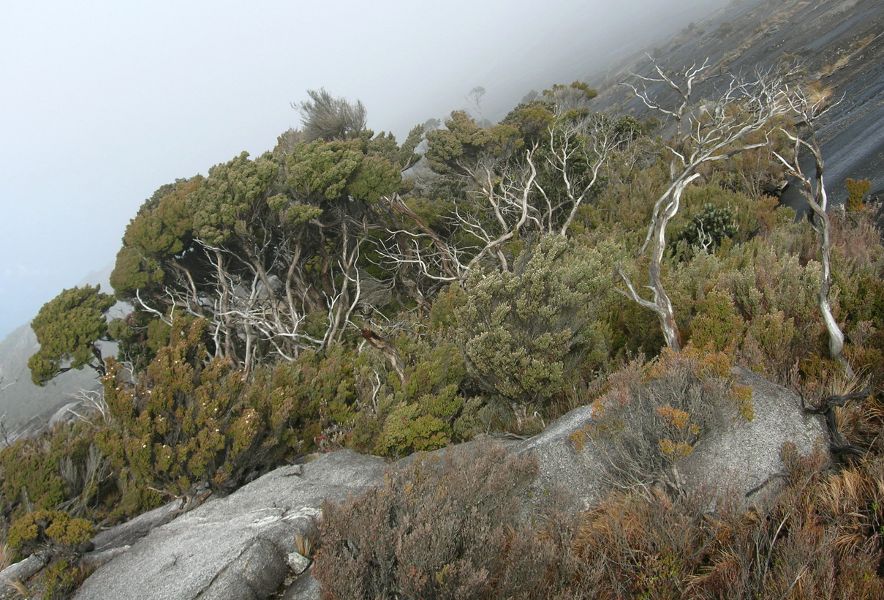 On Mt. Kinabalu (4095 m; see Visit the Alpine), the summit region is composed of spectacular, bare volcanic rocks offering little substrate and shelter for trees. Hence, the actual position of the high elevation tree limit (Fig. 1) may be suppressed by < 50 m from where it could be if there were sufficient substrate. The elfin wood treeline is formed by two species.